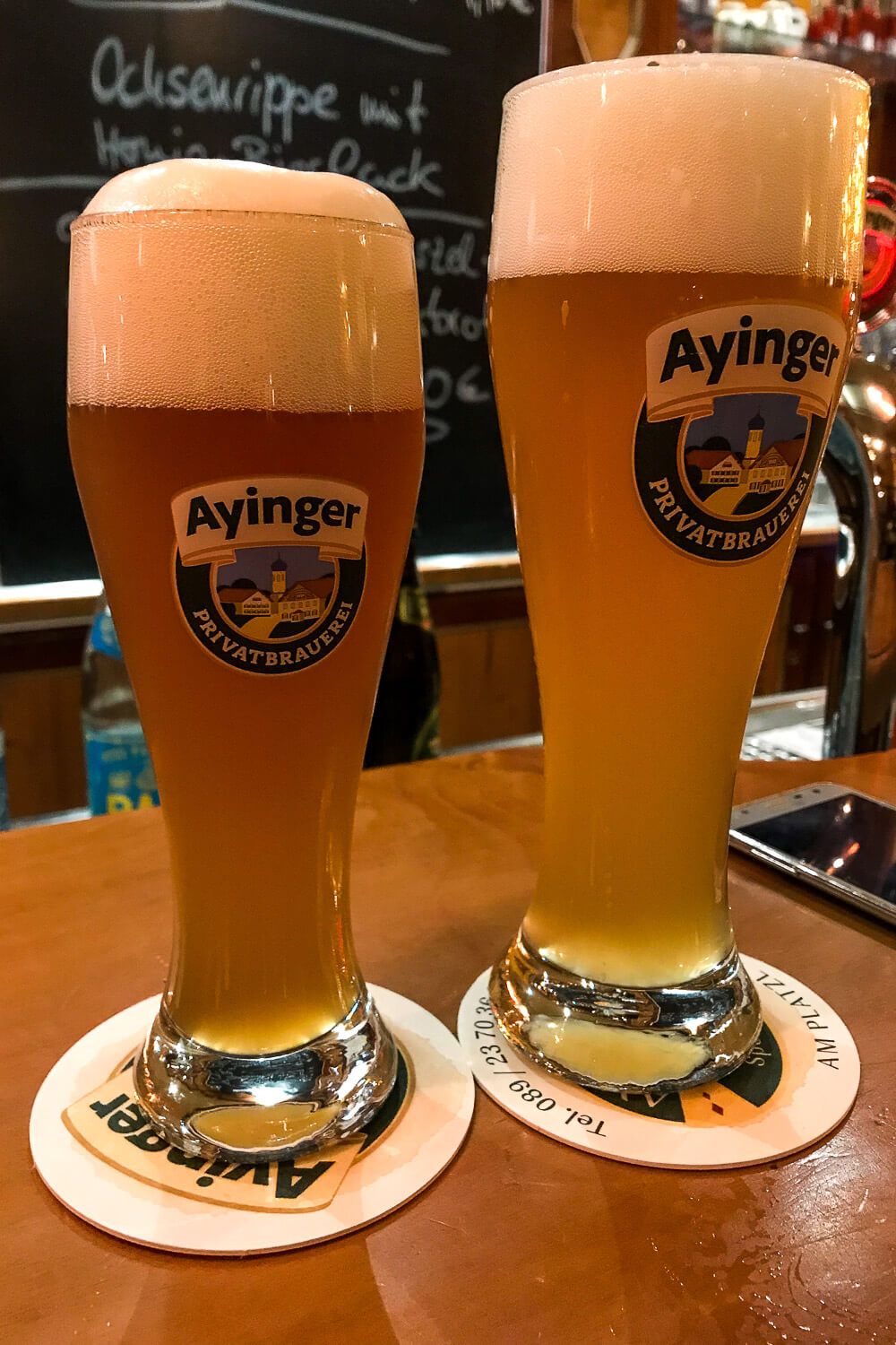 Instead of heading to Hofbrauhaus, we went across the square to Ayinger am Platzl (Wirsthaus Ayingers). This one was much more restaurant-y feel. Most people eating there had reservations, but we were able to grab seats at the bar. And though the bartenders were crazy busy, we were able to order food and drinks.